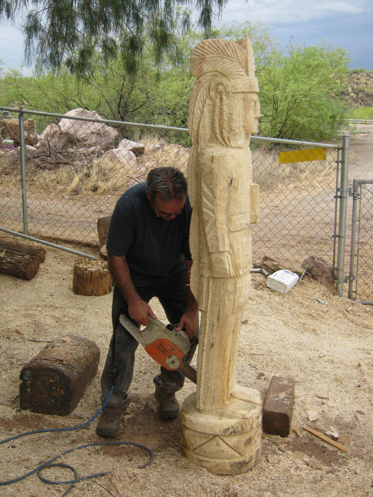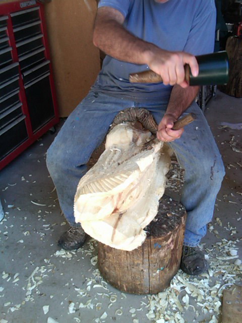 Here you'll find Frank chain sawing and doing chisel work on his carvings.
